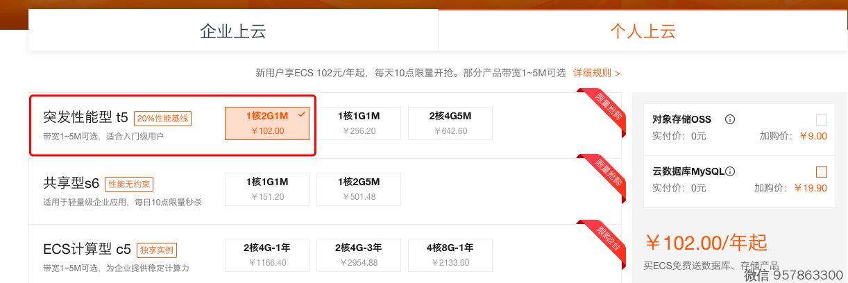 不管是 突发型、共享型,个人用都无所谓,选最便宜的ECS