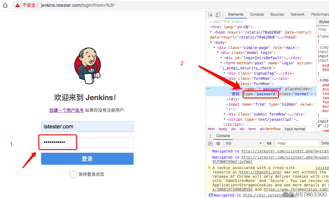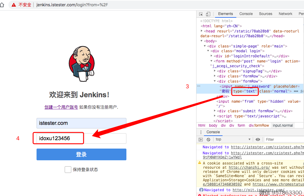 2、在浏览器底部/侧边打开的窗口中,找到密码输入框对应的代码行,并把其中的 type="password" 改为 type="text"