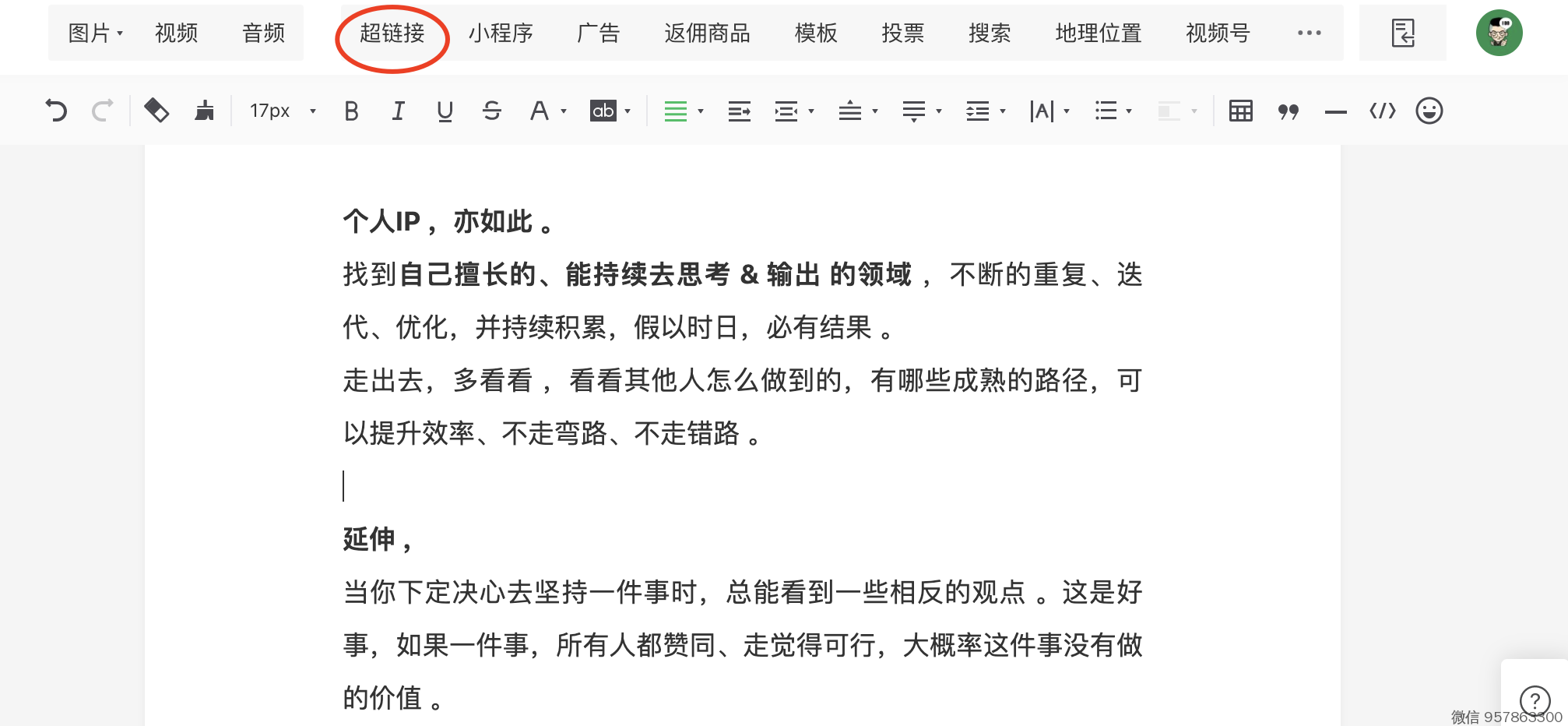 路径:文章编辑 - 点「超链接」- 选择插入的文章
